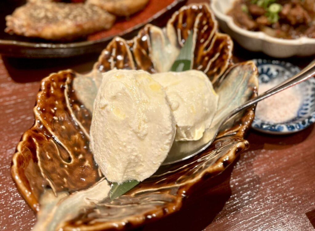 현지 후지에다의 미우라 두부에는 올리브 오일이 은은하게 뿌려져 있고, 암염이 곁들여져 있습니다.